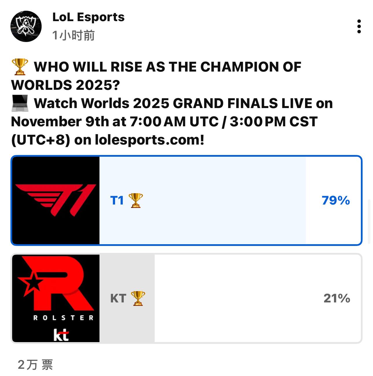 [流言板]LOL官方發(fā)布決賽預測投票結果:79%投票者支持T1取勝由虎撲游戲電競資訊 發(fā)表在英雄聯(lián)盟 https://bbs.hupu.com/lol