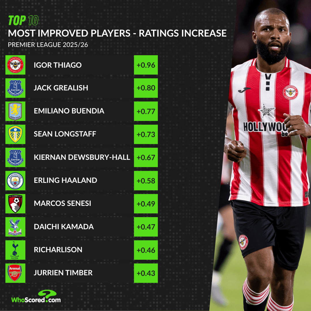 虎撲11月11日訊 WhoScored盤(pán)點(diǎn)本賽季至今英超球員場(chǎng)均評分較上賽季增幅榜,布倫特福德前鋒蒂亞戈第一,季英格拉利什第二。超球