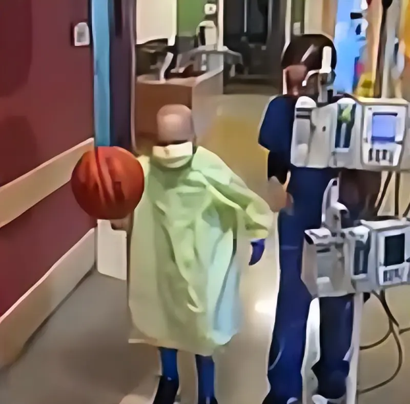 布羅迪會(huì )在治療間隙練習運球,在病房角落放上小球框,模仿著(zhù)庫里投三分的姿勢。