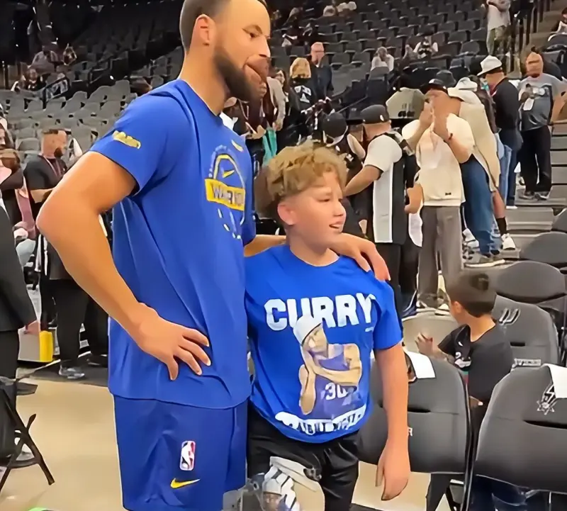 一位小男孩穿著(zhù)庫里晚安的藍色T恤,起初庫里并沒(méi)有在意。