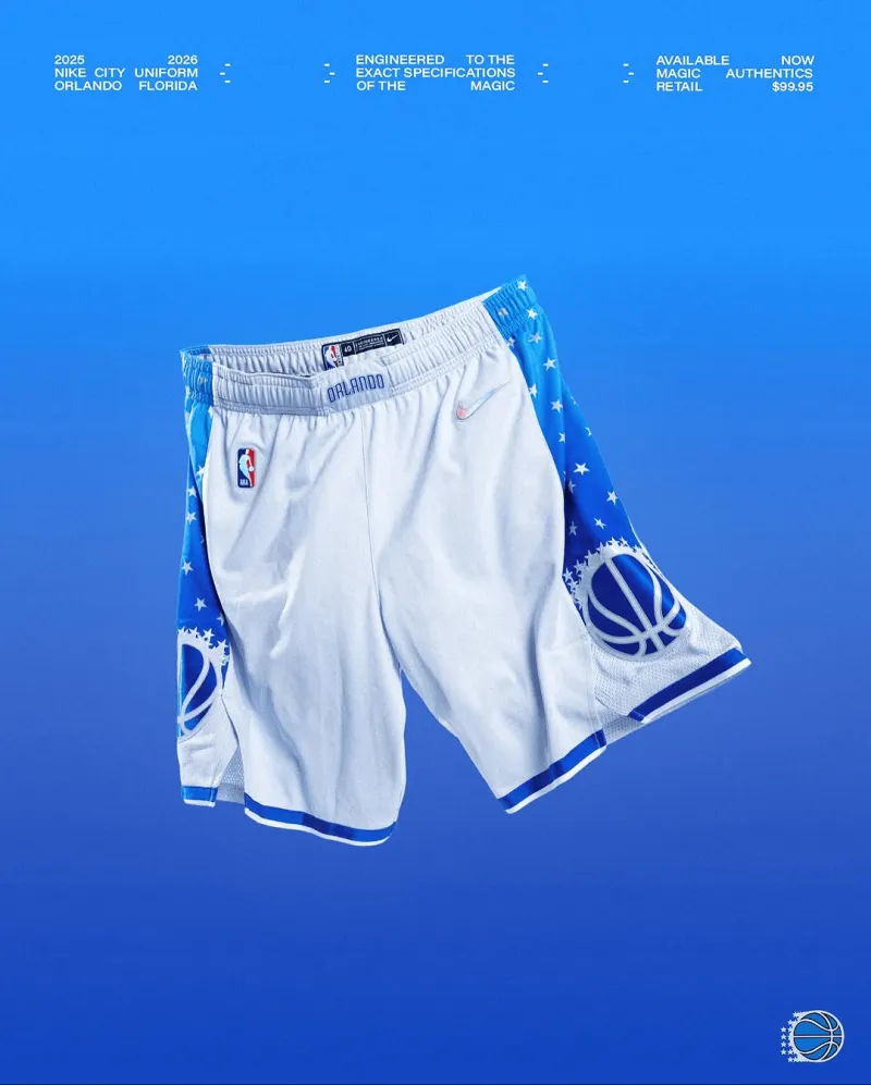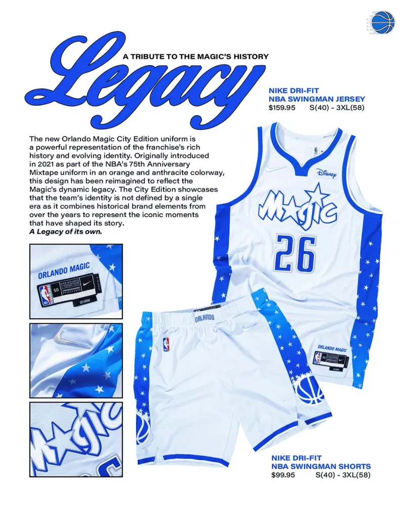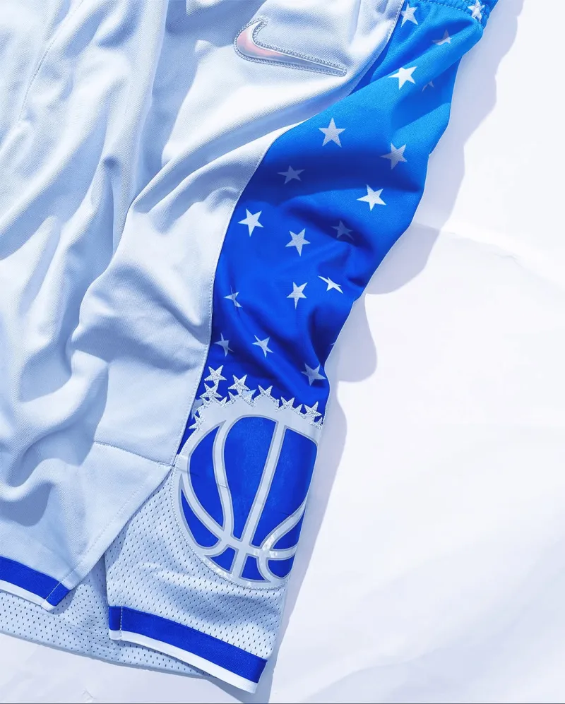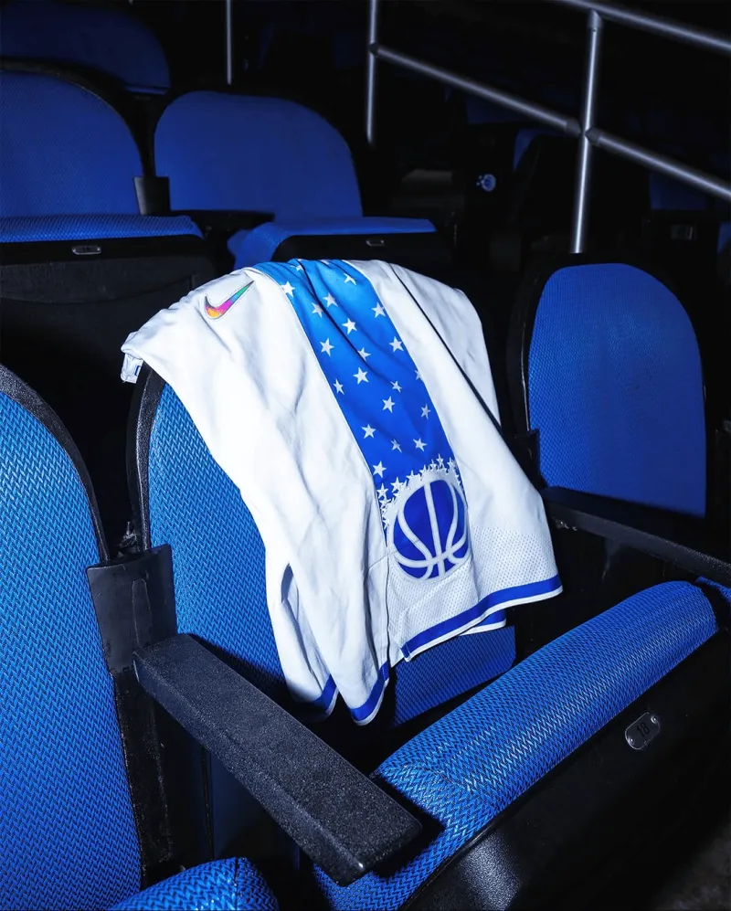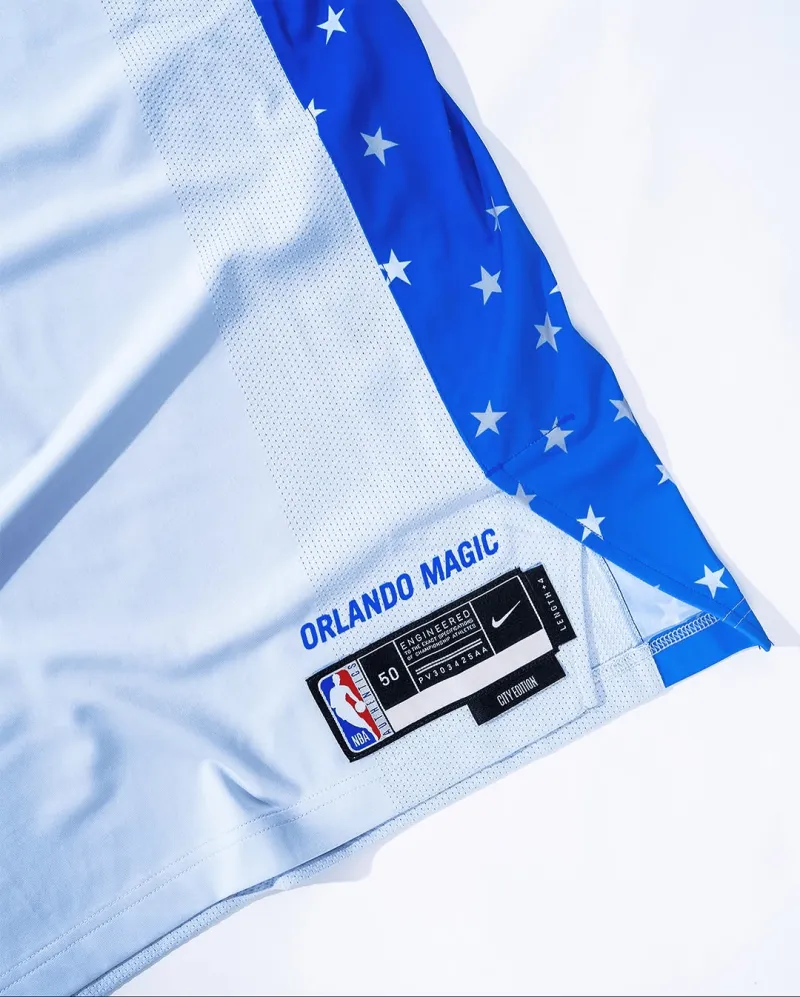 胸前為魔術(shù)經(jīng)典的城市暗星造型隊名,球服兩側拖著(zhù)白銀色星星尾巴的籃球圖案來(lái)自魔術(shù)隊的早期隊標,深藍至淡藍漸變條紋上遍布白銀色五角星圖案。