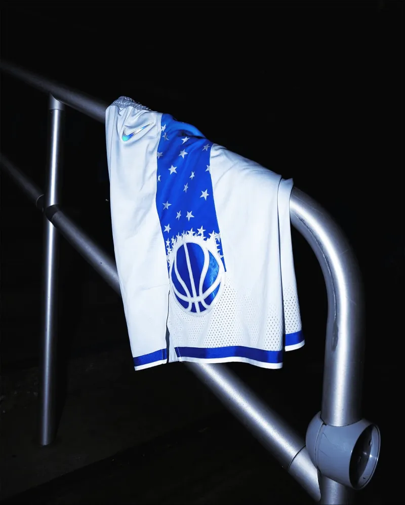此球衣延續了球隊2021-2022賽季城市版球衣的星魔新款設計風(fēng)格,僅將此前的城市黑橙色涂裝更換為白藍色。