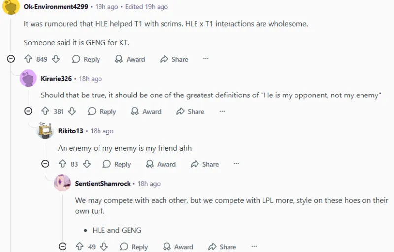 有傳言說(shuō)HLE幫助T1進(jìn)行了訓練賽。HLE和T1的互動(dòng)很暖心。