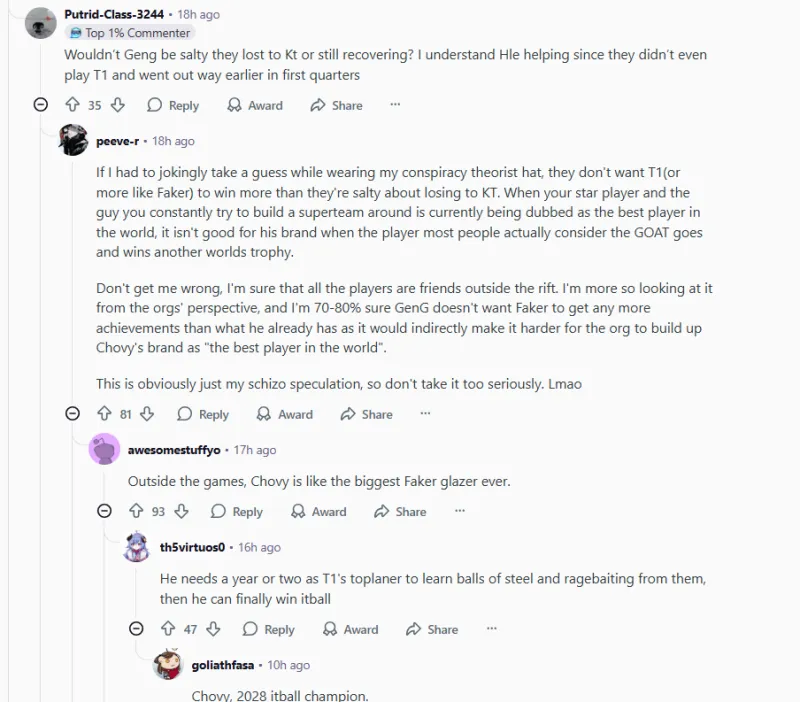別誤會(huì ),我確信所有選手在賽場(chǎng)外都是朋友。我更多的是從俱樂(lè )部的角度來(lái)看待這個(gè)問(wèn)題,而且我70%-80%確定GenG不希望Faker獲得比他已經(jīng)擁有的更多的成就,因為這會(huì )間接使俱樂(lè )部更難將Chovy塑造成“世界上最好的選手”。