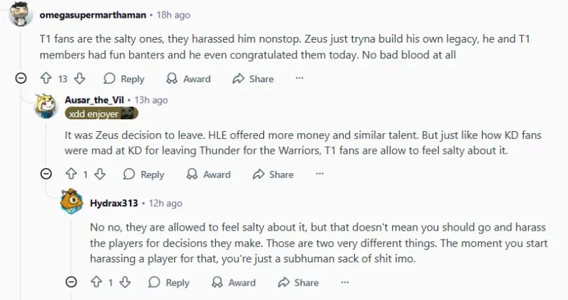 離開(kāi)是Zeus的決定。HLE提供了更多的錢(qián)和相似的陣容天賦。就像KD的粉絲因為KD離開(kāi)雷霆加盟勇士而對他感到不滿(mǎn)一樣,T1的粉絲也可以對此感到不爽。