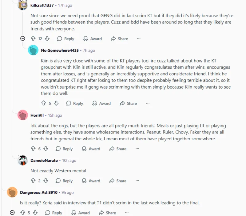 我不確定,因為我們需要證據證明GENG確實(shí)和KT進(jìn)行了訓練賽,但如果他們這樣做了,很可能是因為選手之間關(guān)系很好。Cuzz和Bdd已經(jīng)出道很久了,他們可能和所有人都是朋友。