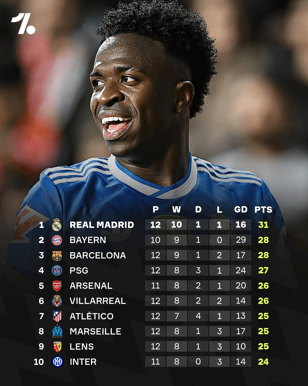 虎撲11月11日訊 One Football統計了本賽季歐洲五大聯(lián)賽的總積分榜,皇家馬德里處在榜首位置: